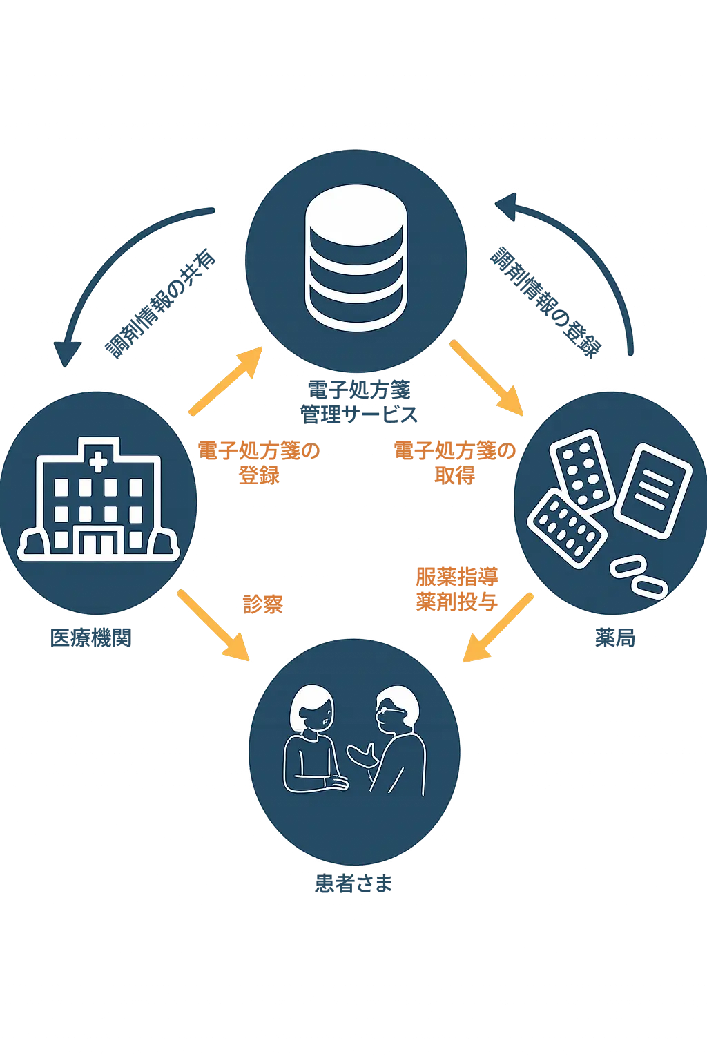 紙の処方箋をデジタル化し、国の「電子処方箋管理サービス」で医師・薬局間の処方情報を共有する仕組みです。